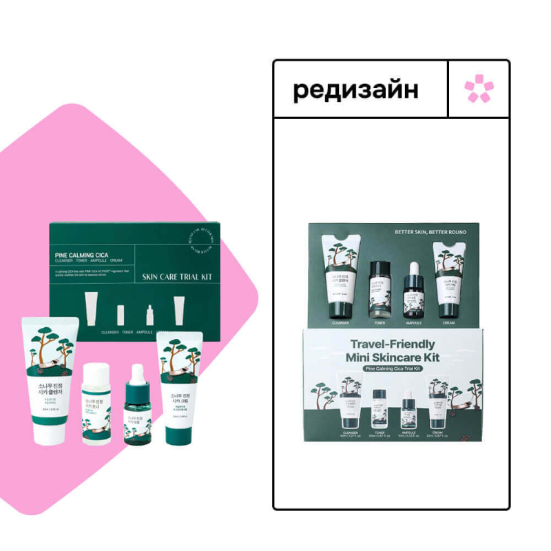 Travel-набор Round Lab Travel-Friendly Mini Skincare Kit Pine Calming подходит для первого знакомства с популярной серией. Содержит продукты, которые успокаивают раздражение, ускоряют заживление акне и восстанавливают.