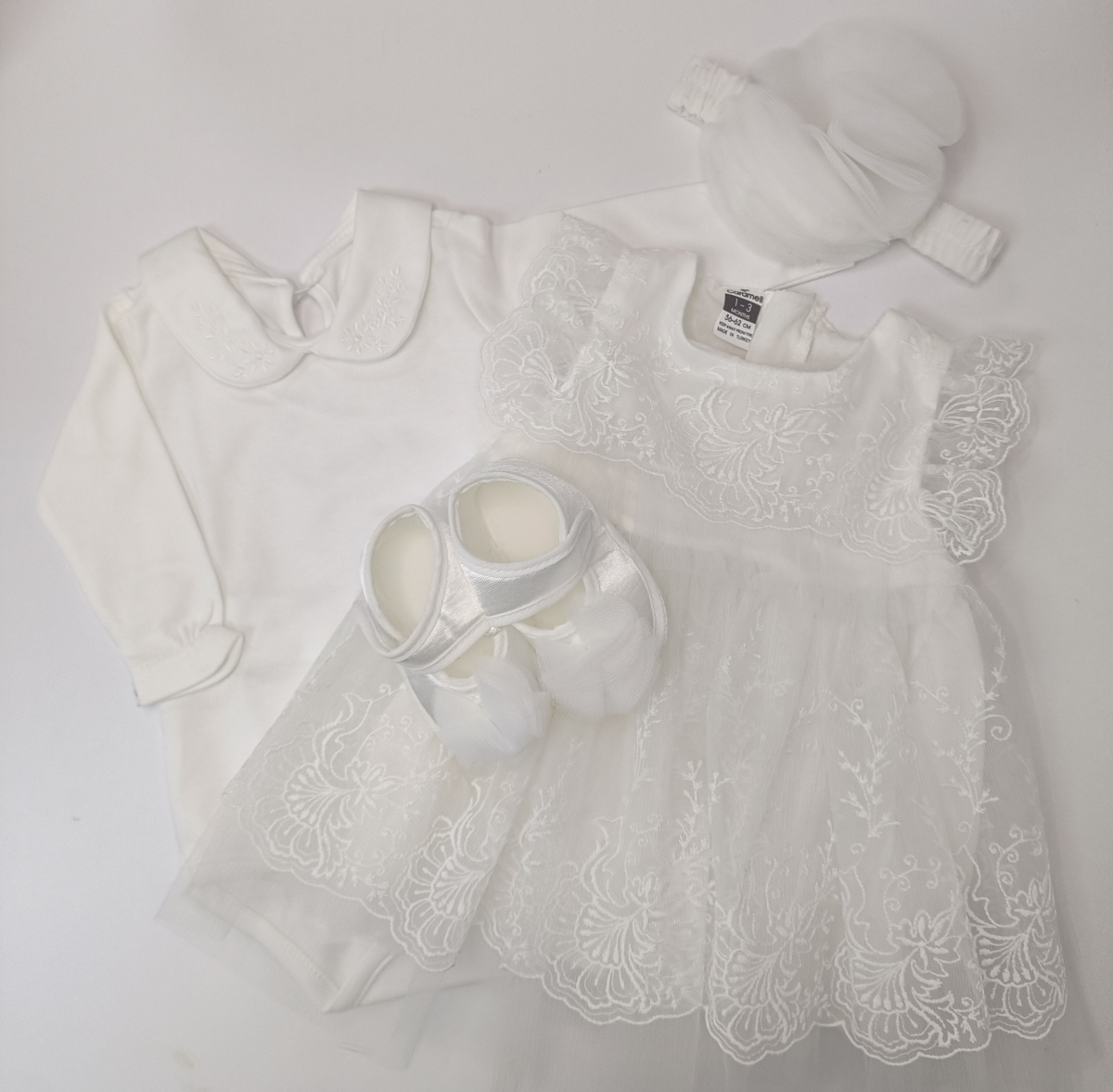 В наборе боди, платье, пинетки, колготки и повязка на голову. В подарочной коробке