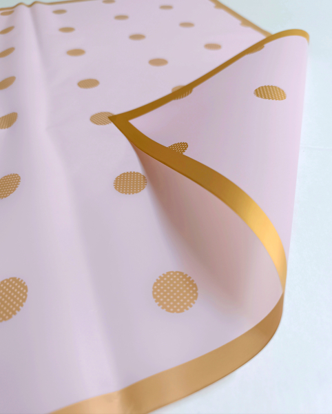 УПАКОВОЧНАЯ ПЛЕНКА НЕЖНО РОЗОВАЯ , ЗОЛОТО ГОРОХ И КАНТ 60*60 СМ