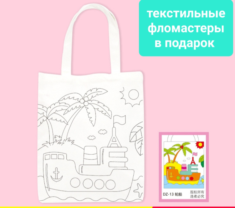 ШОПЕР РАСКРАСКА КОРАБЛИК, ТЕКСТИЛЬНЫЕ ФЛОМАСТЕРЫ В ПОДАРОК