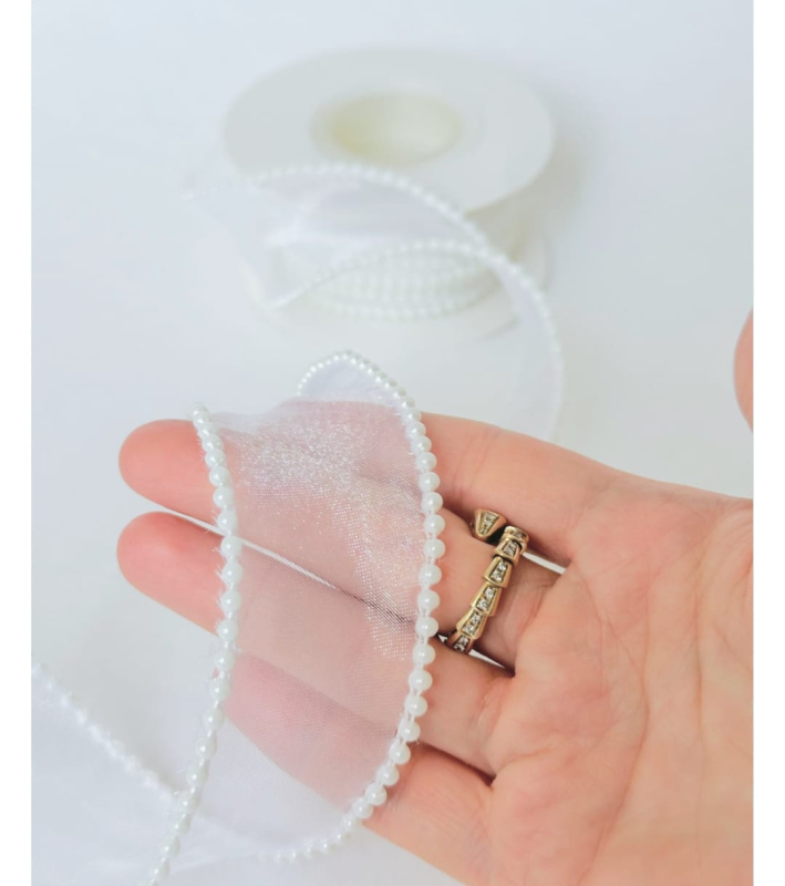 ОРГАНЗА КРЕМОВАЯ С ЖЕМЧУЖИНАМИ, 4 СМ (4,7 М)